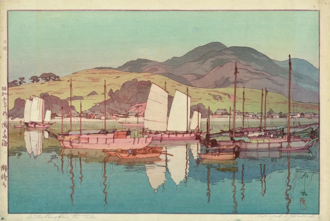 提到日本二十世纪初期的新版画运动,除了主导该潮流的新一代版画出版商渡边庄三郎之外,其最具代表性两位艺术家便是川濑巴水和吉田博——凄清的日式风情是巴水的经典绘画语言,而曾多次出国采风的吉田博更擅长刻画氤氲的空气感。吉田博擅长油画和版画,重视自然、写实和诗情浪漫的画风,用套色木版画表现油画般的微妙光感和明暗变化是他的拿手好戏。他用传统技术融合西洋画的艺术表达,基于浮世绘拓印发明了新的专用版画技术。有时他使用同一块板木,根据作品主题而改变拓印的色彩,巧妙地表现时间和天气的变化。