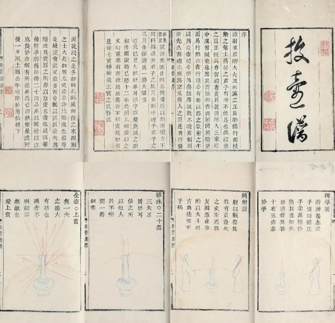 是书为活字三色套印本,卷首有道光三年沈钦韩序,嘉庆二十四年李瑶自序,次格例,正文收录投壶图名目二十四品,外图六,补例旧谱九法,末有道光九年李瑶跋,称此本乃“道光己丑秋就毕升活字版变意成之”。投壶是古代士大夫雅集时的一种投掷游戏,亦是中国传统礼仪的体现,从先秦延续至清末。投壶礼来源于射礼,由于庭院不够宽阔,不足以张侯置鹄;或者由于宾客众多,不足以备弓比耦;或者有的宾客的确不会射箭,故而以投壶代替弯弓,以乐嘉宾,以习礼仪。宋吕大临在《礼记传》中云:“投壶,射之细也。燕饮有射以乐宾,以习容而讲艺也。”