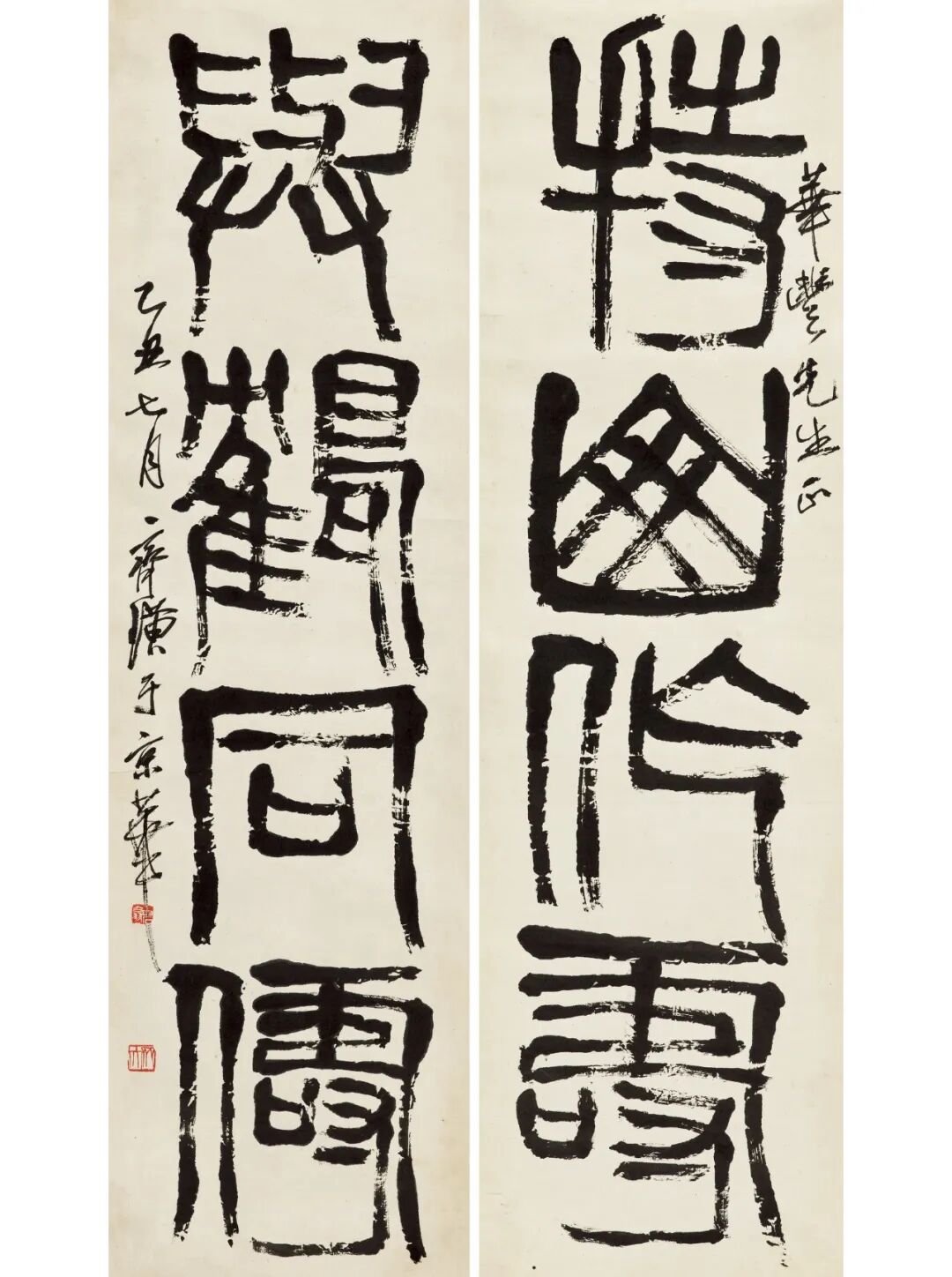 《荷塘游虾图、篆书四言联》是齐白石为友人华丰先生所作。《荷塘游虾图》由题跋知是齐白石作于1920(庚申)年7月17日,时居燕京象坊桥观音寺院。齐白石自1919年为逃避湖南家乡战乱来北京定居,先后落脚过法源寺、龙泉寺、石蹬庵、象坊桥观音寺和西四牌楼迤南三道栅栏6号几个地方,1926年才在跨车胡同13号定居下来。