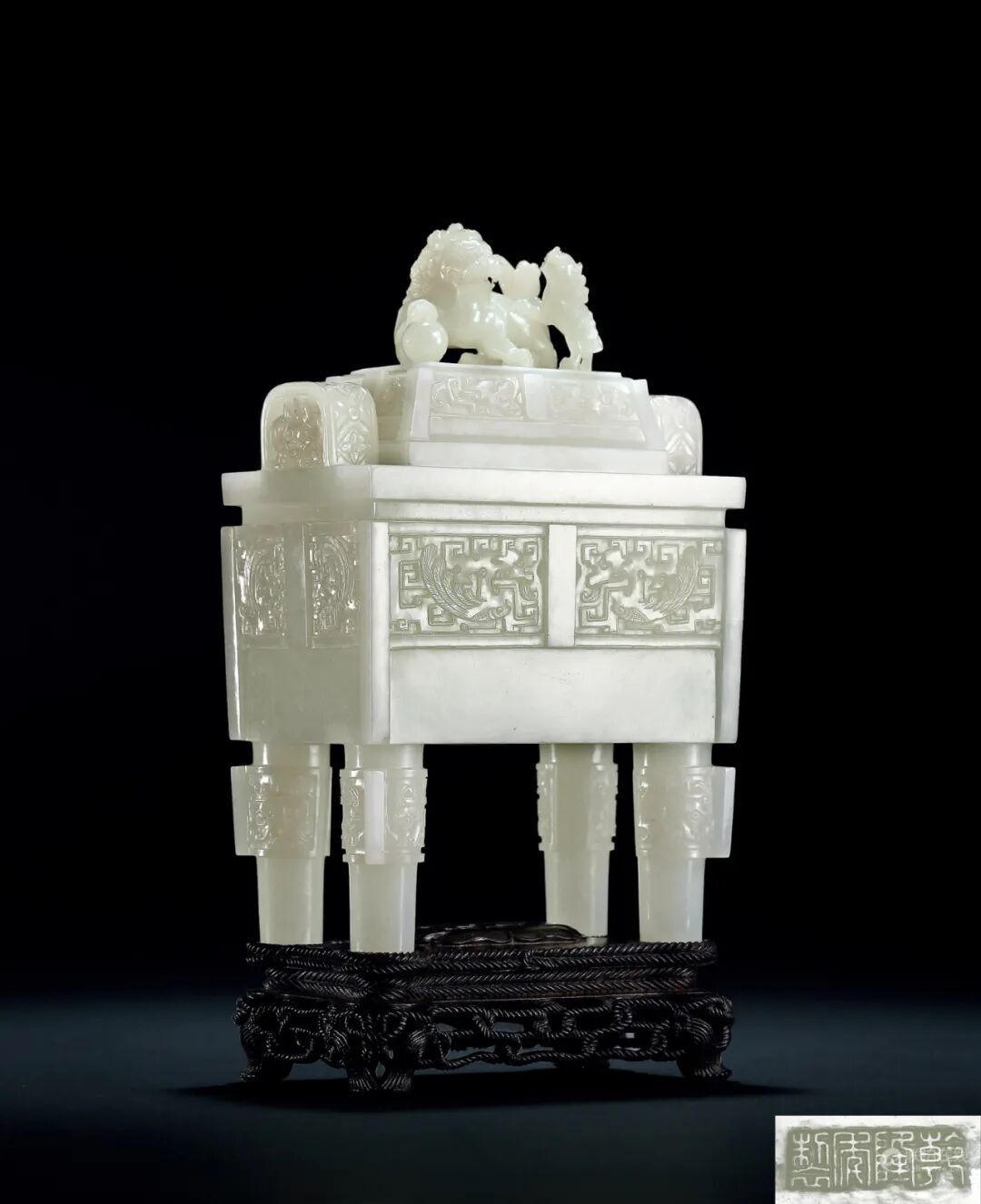 拍品估价:100,000 - 150,000 人民币1.今画偶录载王愫字存愫,太仓诸生,工诗善山水,用干笔皴擦不加渲染,得元人法,其室毛秀秀惠字山辉,亦明画理。乾隆乙卯二月,砚农 【钤印】砚农(朱)未工(白)2.翠滴松梢雨乍收,山光半为白云留。江边可惜无人住,间却花一岸秋。戊申之秋七月既望,闲中弄笔,偶用黄鹤山樵松林远岫图意赠穆如社兄雅鉴。娄水王愫识。 【钤印】王愫印(白)存素(朱)怀古(朱)3.张舍人熙纯题:王存愫黄山云海障子,有王君泼墨如飞一永;三十六峯云气涌,素绢淋漓生面开,谷灵辟易山精恐之句。全首七言长歌,兹摘录以见其概。砚农又录。【钤印】辑五(朱)作者简介:王愫清字存素,号林屋,一号朴庐,江苏太仓诸生,侨居苏州。原祁侄。山水干墨重笔不加渲染,得元人简澹法。绛笔竹石尤妙。间作青绿设色,亦绰有原祁秀韵。特笔意薄弱未能浑厚,故秀润中无高古之趣,与王昱、王玖、王宸称(小四王)。尝为王兰泉司寇画三泖渔庄图,分春、夏、秋、冬四帧。工诗词,与诸名士倡和,每作画必自题诗。著林屋诗馀。朴庐存稿中附论画一卷。乾隆二十八年(一七六三)尝作天香染袖图扇藏故官博物院。卒年八十六。主要作品有:《清画家诗史》《华海堂集》《怀旧集》《今画偶录》《墨林今话》《桐阴论画》《明清画家印鉴》。王愫属于清代正统派名家,其叔叔正是作为当时画坛领袖的王原祁。这幅《松林远岫图》是王愫成熟期的作品。根据画中题跋可以了解这幅画的具体创作经过。王愫先从几座山之间的整体关系入手,特意弱化了空间结构,尽可能地表现出心中松林山水钟灵毓秀的一面。画中远、中、近三个层次都有场景。远山瀑布飞流,密林成荫,山峦顶部布满苔点。山居之下是一汪泉水,继续向下流淌。动静相接,亦是留白,亦是与后景山间雾气行成呼应,构成了节奏上的律动。让人更加感觉意境的通透,虚实间的距离。画中的山水,并不是风光实景写生,而是王愫心中的山水。这一点,体现了他创作前的反复斟酌,细致构思。如此气象万千的作品,容不得一丝败笔,所谓气韵,这是中国山水的魅力,亦是东方审美的魅力。拍品估价:5,000,000 - 6,800,000 人民币来源:北京翰海,2001年秋季拍卖会,编号1484,成交价247.5万人民币。此狮钮鼎式长方炉选用和田白玉整雕而成,覆斗形钮盖,榫口契入器身。方唇厚沿,侧边对称双立耳。腹部微呈上阔下收之势,束颈,平底下承以四柱足。顶部炉钮圆雕一大一小两狮子,大狮卷眉尖耳,双目炯炯,阔鼻大口,獠牙外露,环颈满布坨坨螺发,长须飘垂。其身躯后驱,两后腿蹲坐,左前肢支体,右爪踩球,团尾扬翻,动态矫健,肌骨壮硕。小狮憨态可掬,昂首雀跃,两前肢趴扶大狮臀股,后腿站立,玩耍嬉闹。大狮小狮,谐音“太师少师”,寓意美好,矗于炉顶,立意已明。盖四面与四棱起脊,长短交替,以之为界为轴,对称面面相对的夔龙纹。鼎耳表面阴刻菱形朵花锦地,耳内镂空,作耳立竖发双目倒悬的兽面。鼎腹四棱四面,同出长短脊,腹上部环绕凸起的纹饰带,以脊分隔,作对称的夔凤纹。体躯变形,方折曲折,唯翅翼舒展,翎羽丝丝分明。腿亦起脊,与盖、腹呼应。脊作鼻基线,浮雕粗眉狭目的兽面纹。外底中部打浅洼,篆书阳纹“乾隆年制”横排四字款。