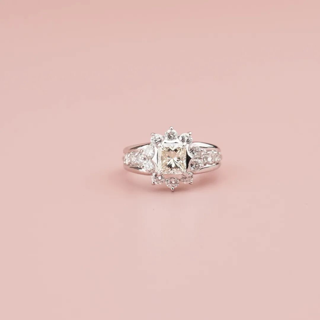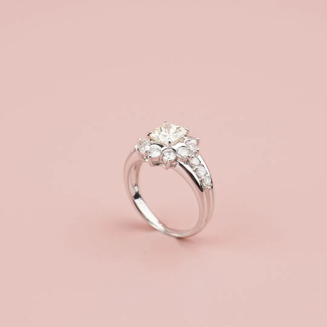 铂金PT900镶嵌方形切割钻石,主石重约1.03克拉,配圆形钻石共重约1.0克拉。款式大气,做工精致。