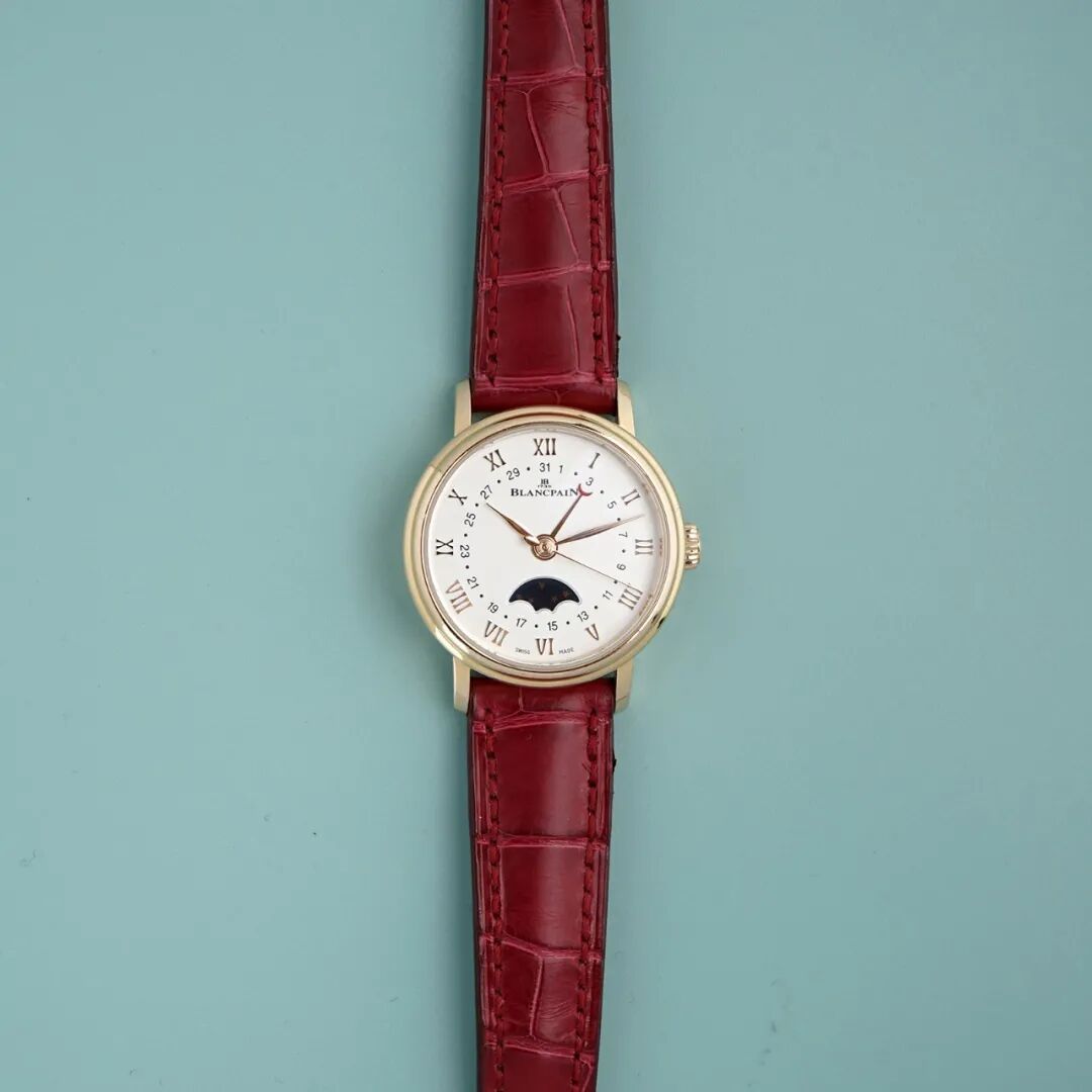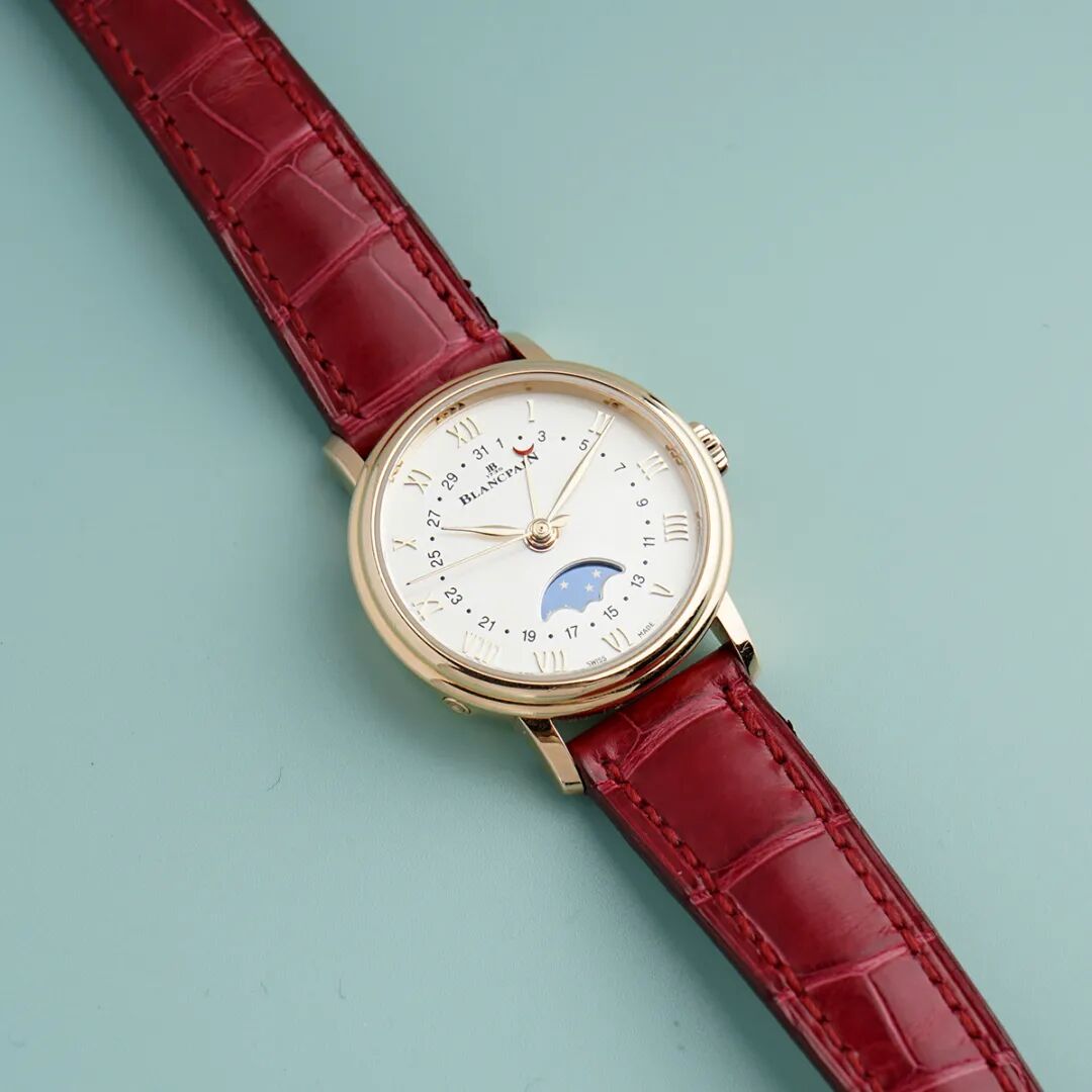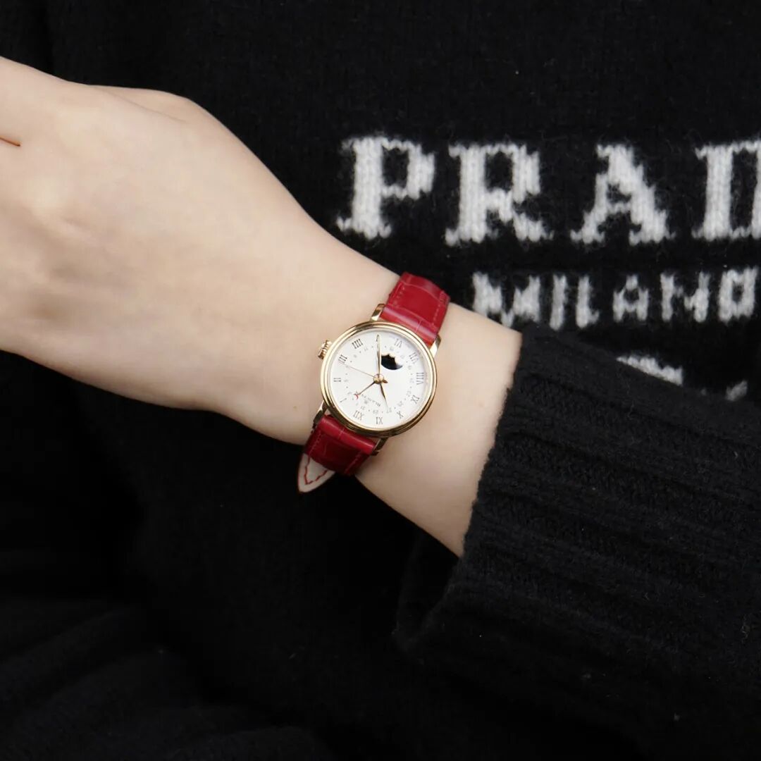 白色表盘,大三针,立体罗马字刻度,6点钟月相显示,中心指针式日历