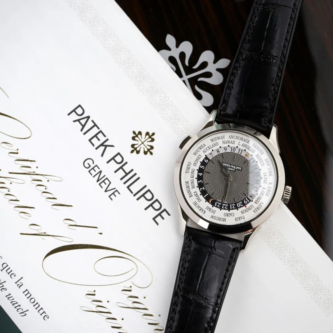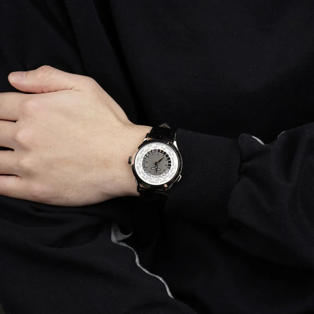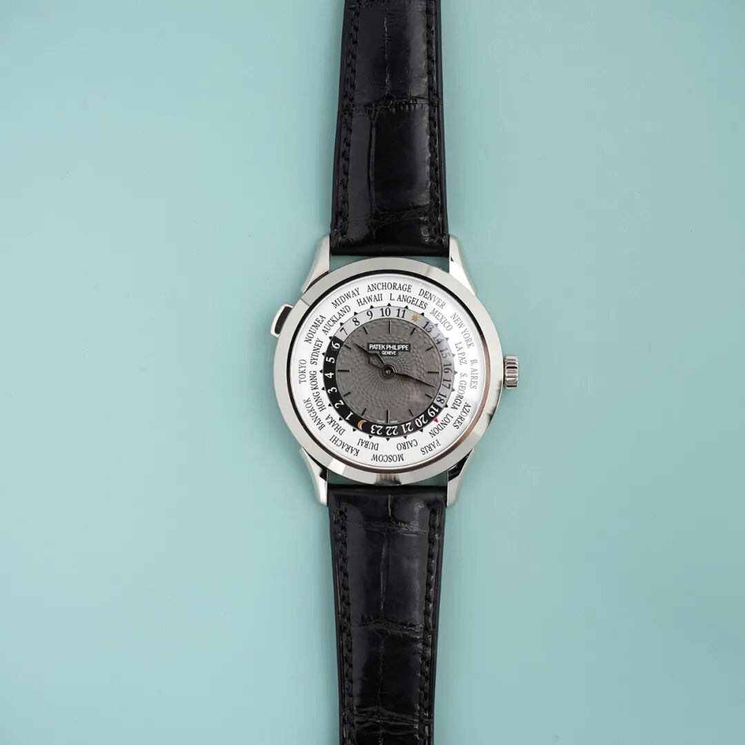 炭灰色漆表盘,中心时针及分针,手工雕饰纹,金质立体时标,世界时间及24小时显示