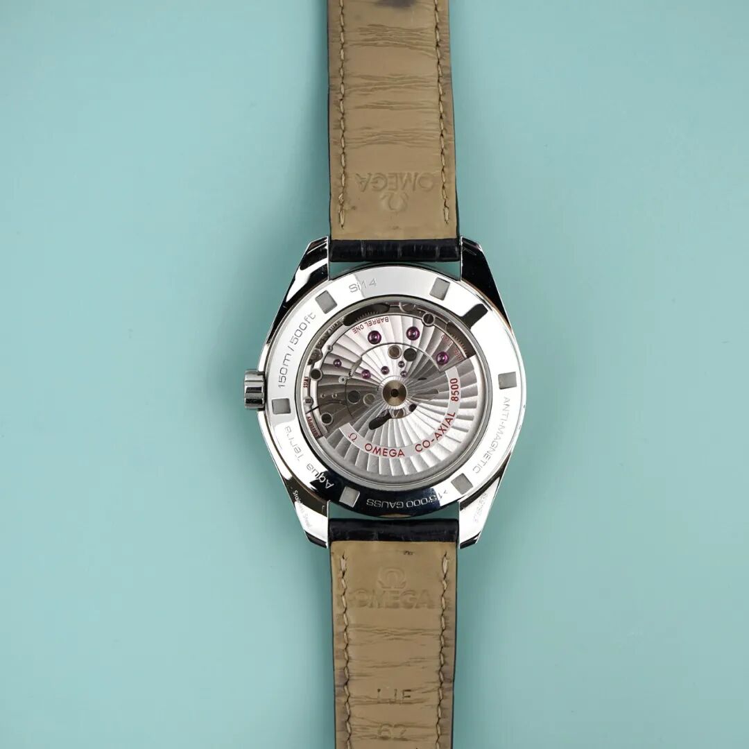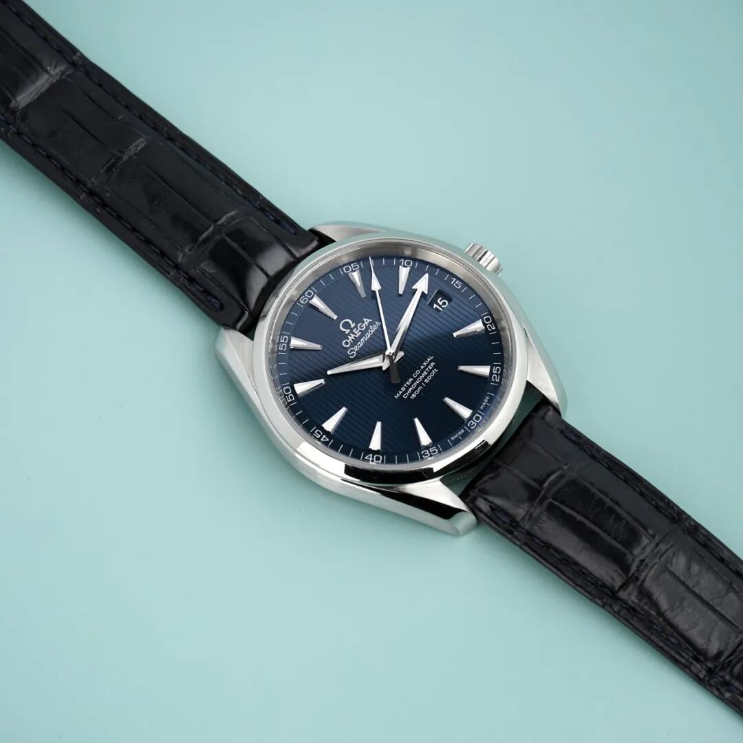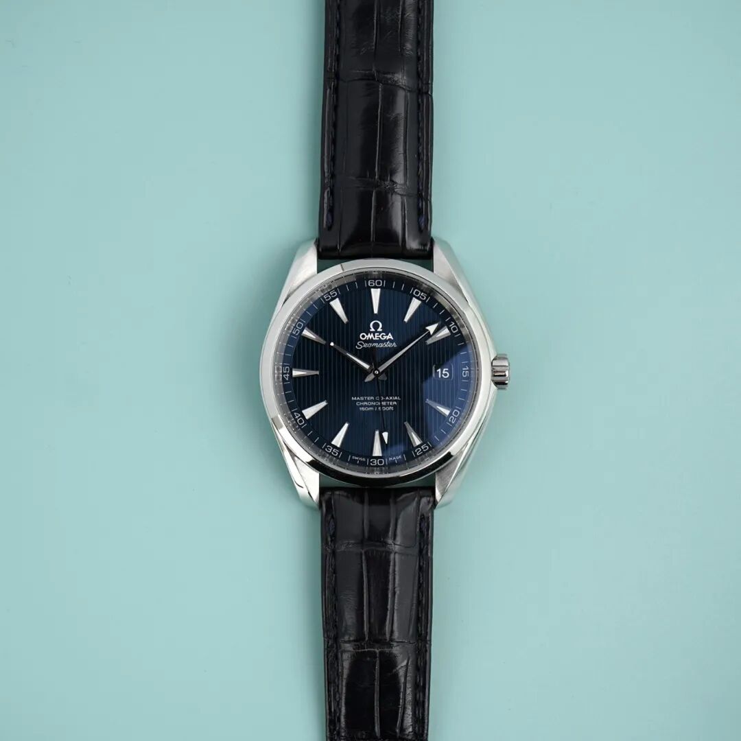 深蓝色条纹表盘,大三针,三角形小时刻度覆以夜光涂层,3点钟日期显示