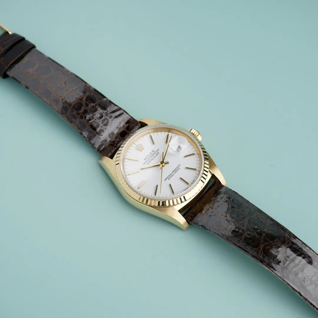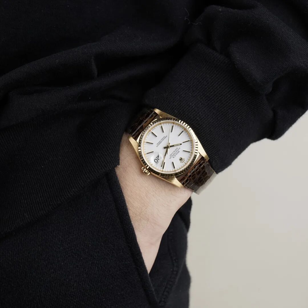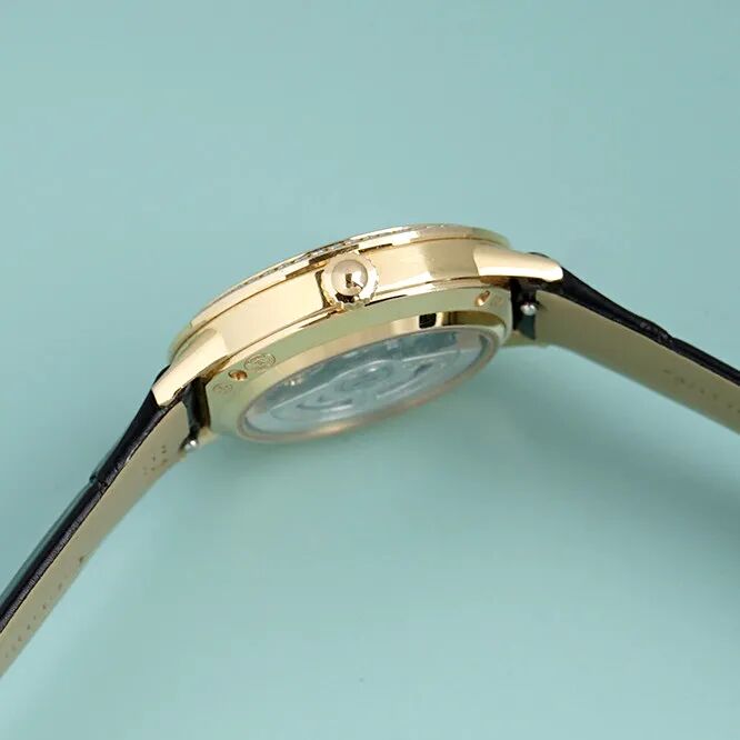 白色表盘,大三针,立体条状刻度。3点钟日期显示