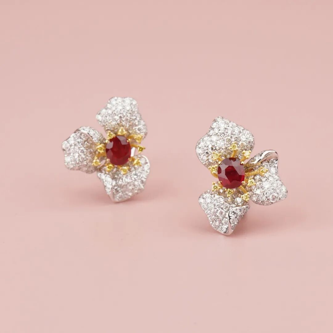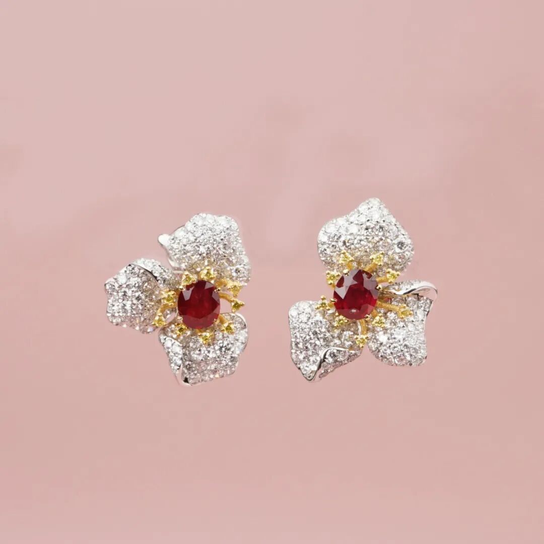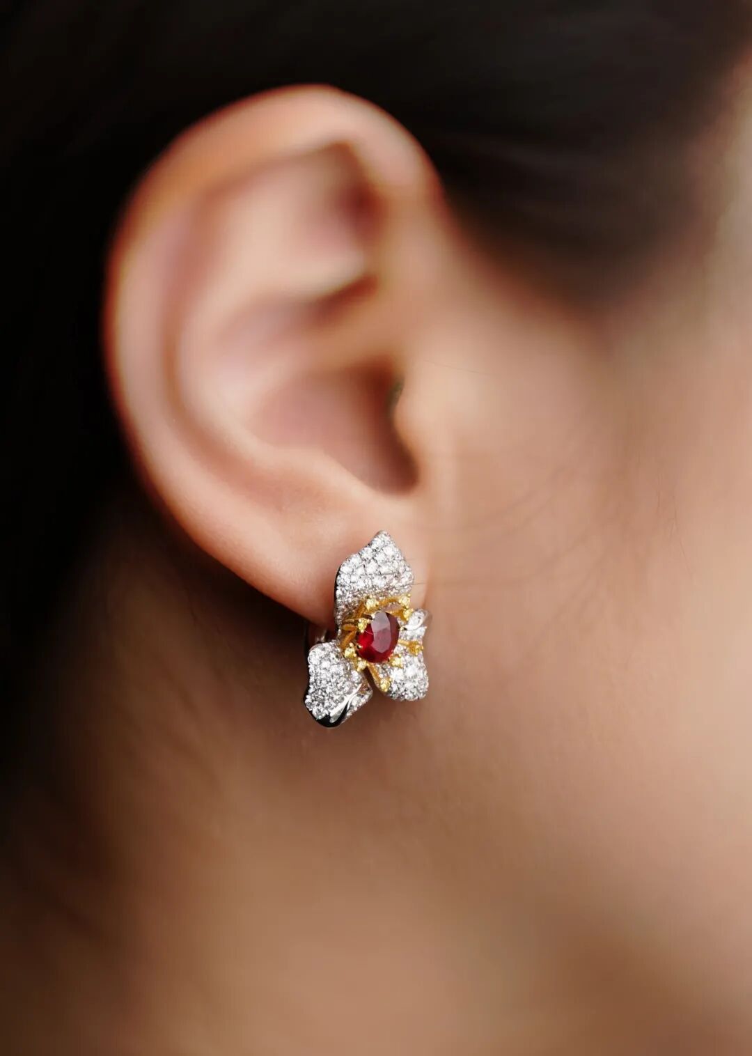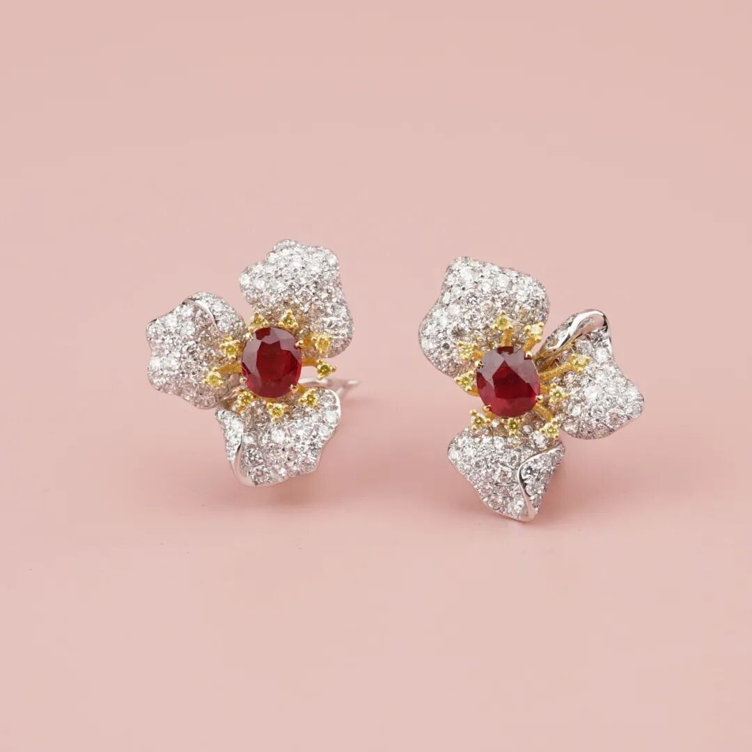 18K白/黄金镶嵌天然红宝石耳环,红宝石共重约1.46克拉,颜色为鸽血红,未经加热。配镶钻石及黄钻共重约1.42克拉。