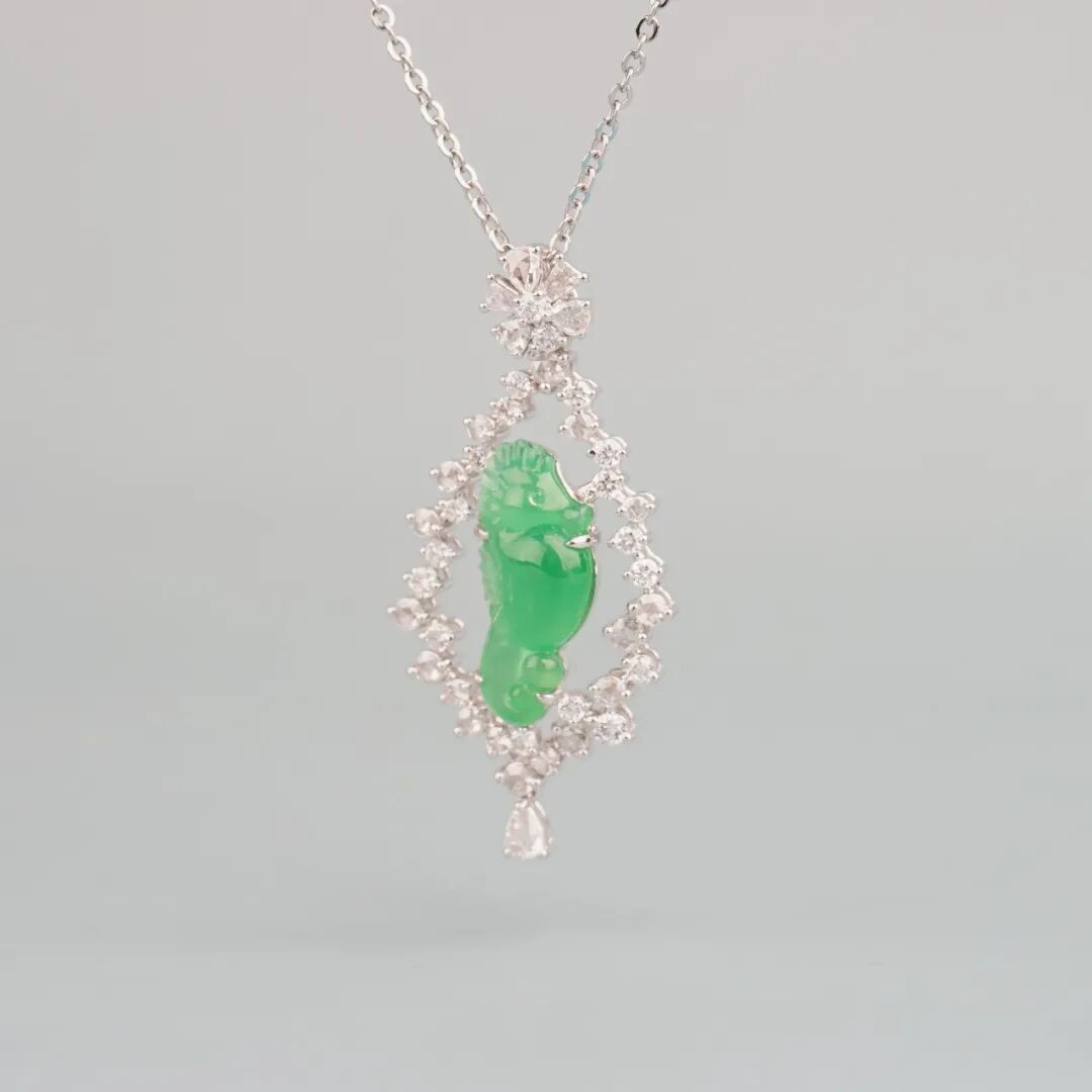 18K白金镶嵌天然翡翠海马造型吊坠,培训圆形及玫瑰型切割钻石点缀。