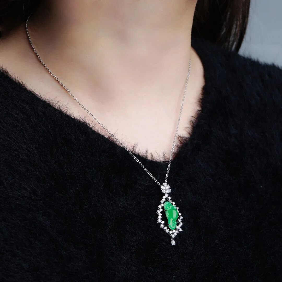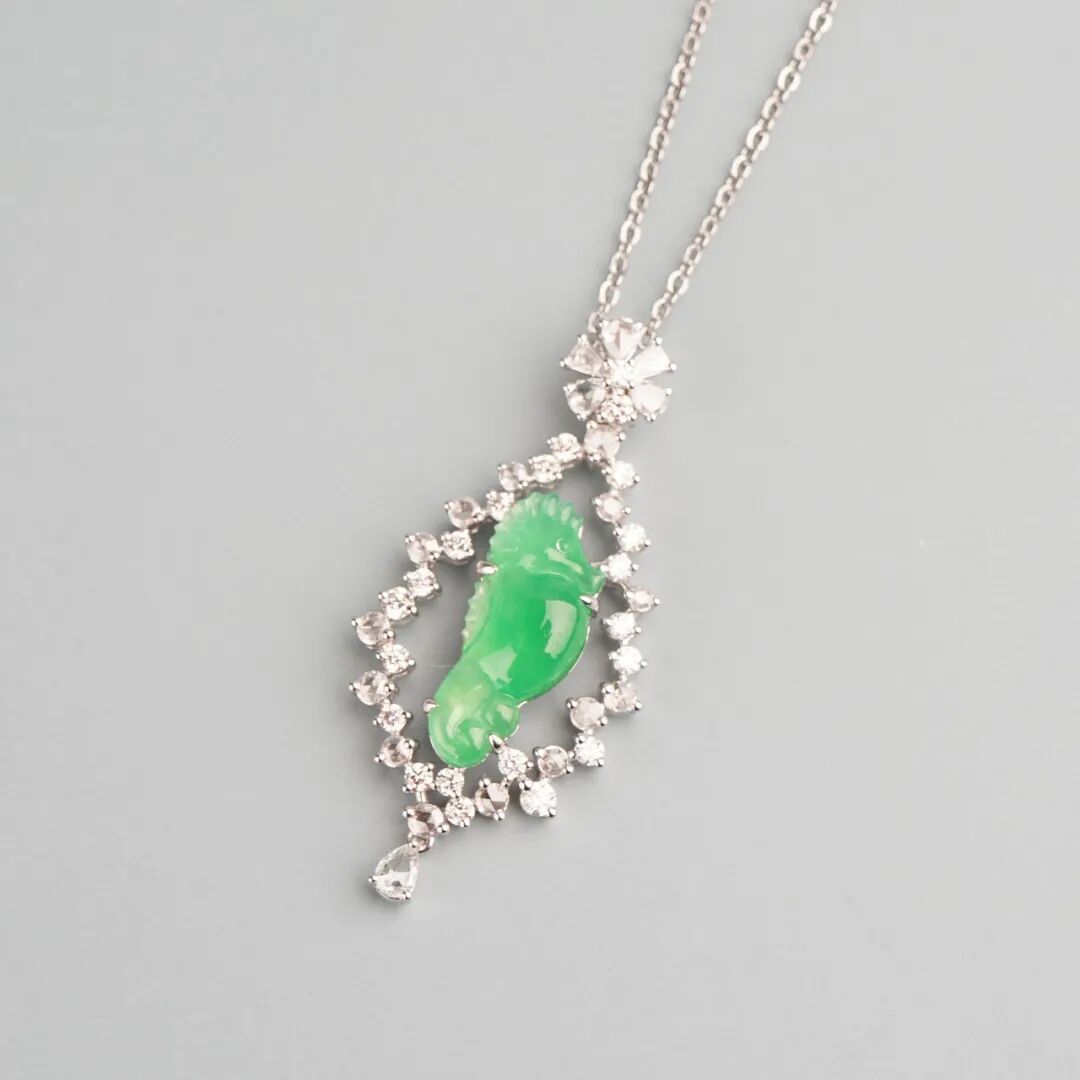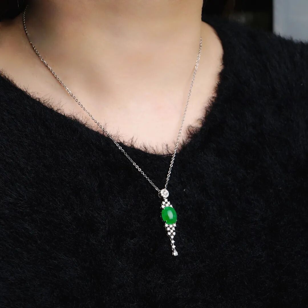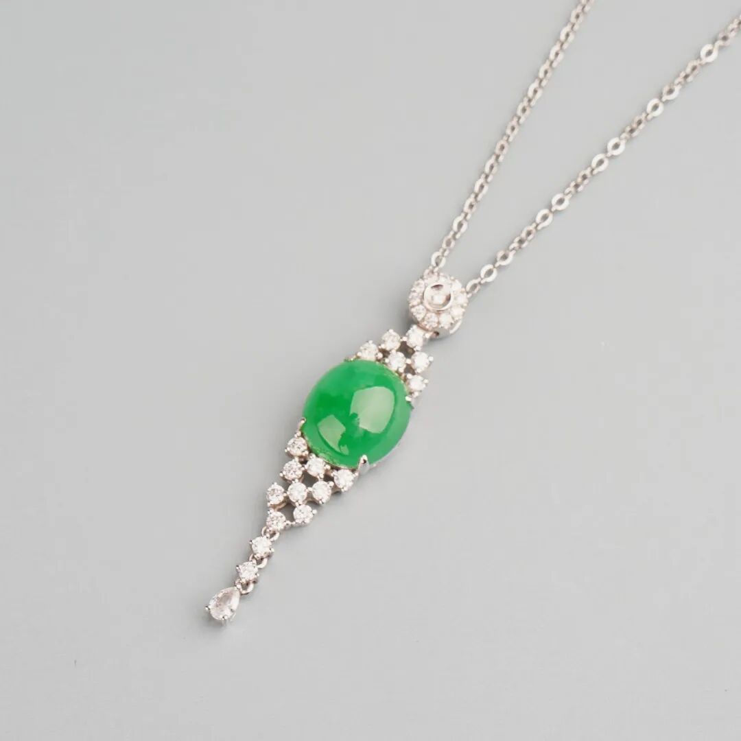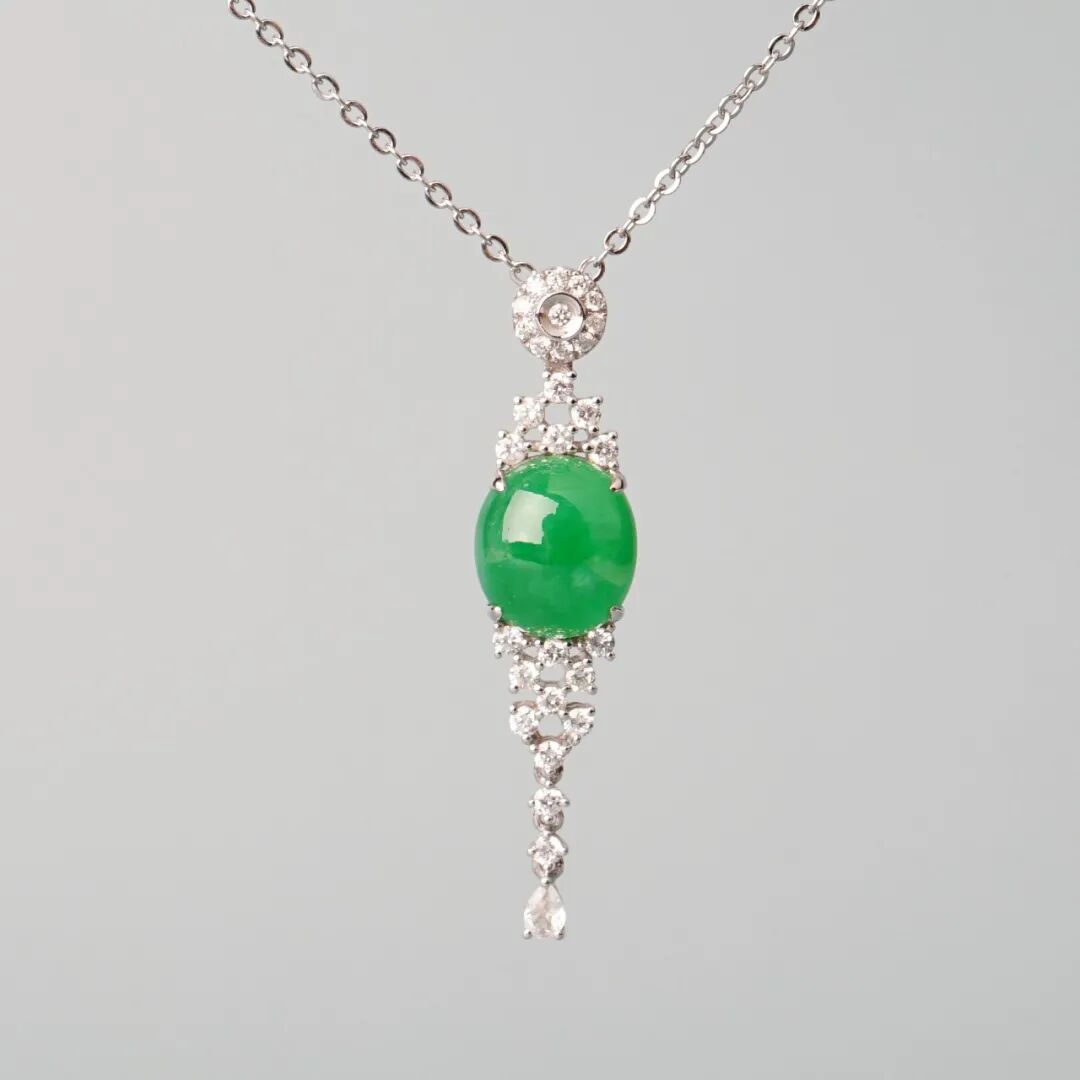 18K白金配镶天然翡翠蛋面吊坠,翡翠翠色莹润,饱满色辣,配镶钻石点缀。