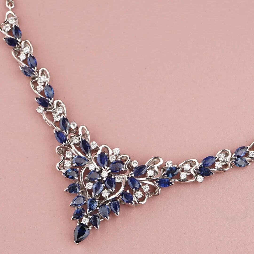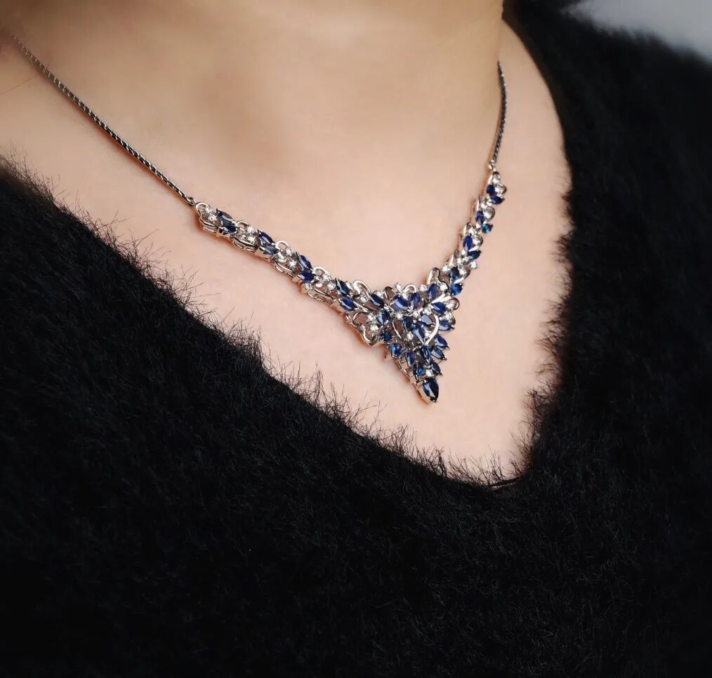 铂金PT900项链天然蓝宝石项链,蓝宝石共重约5.7克拉,配钻石共重约0.75克拉。