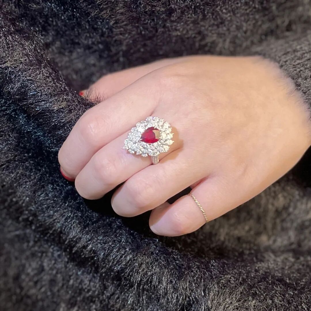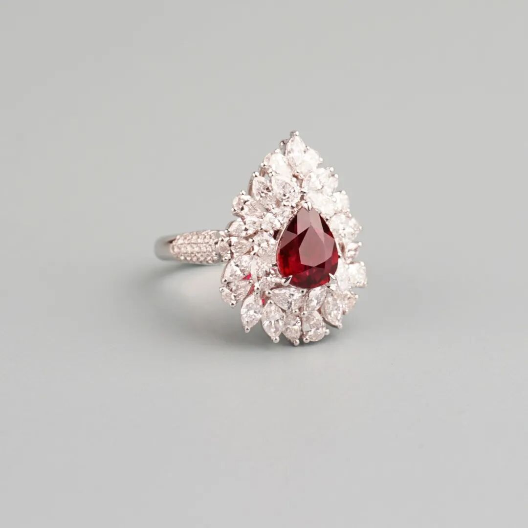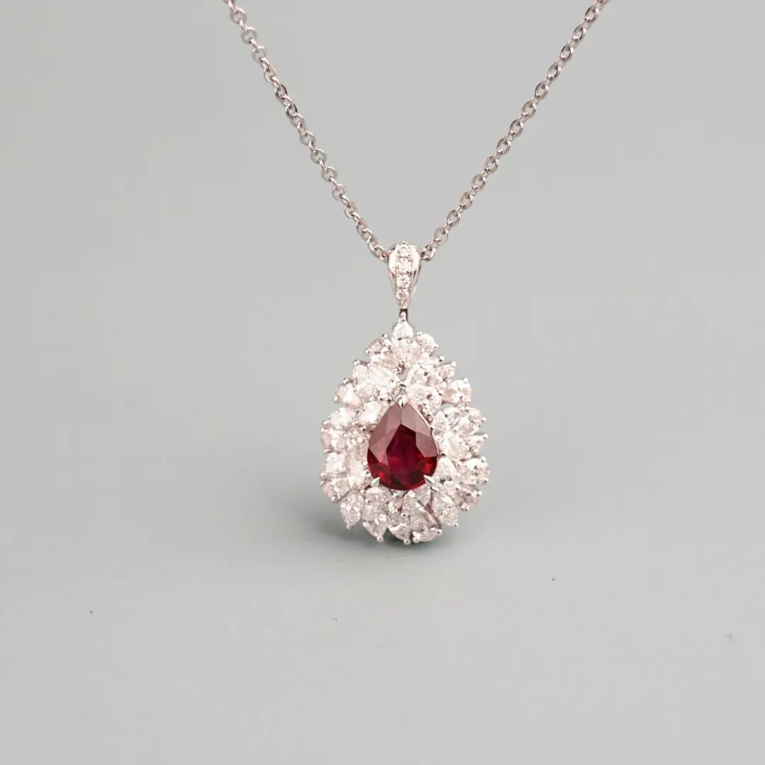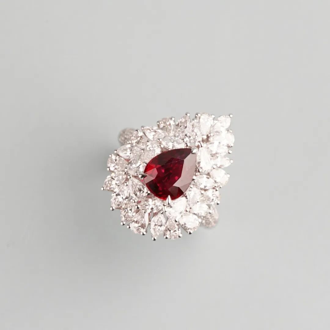 18K白金镶嵌天然红宝石戒指/吊坠,红宝石共重约2.02克拉,产地莫桑比克,颜色为鸽血红,未经热处理,配镶水滴型及梨形钻石共重约2.37克拉。
