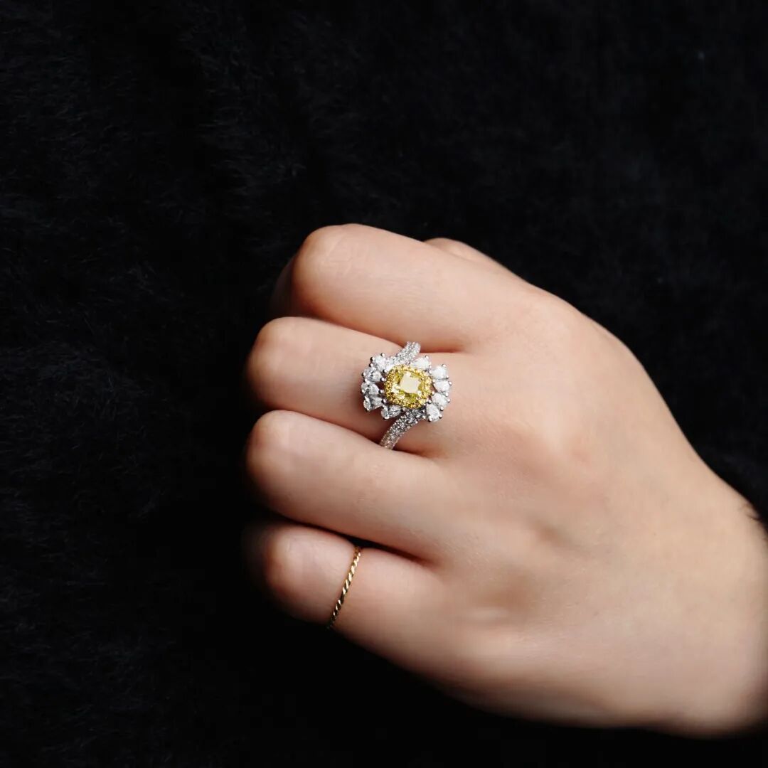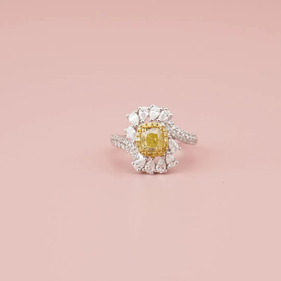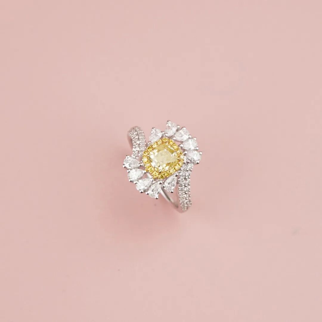 1.01克拉枕垫形彩绿黄色钻石配钻石戒指