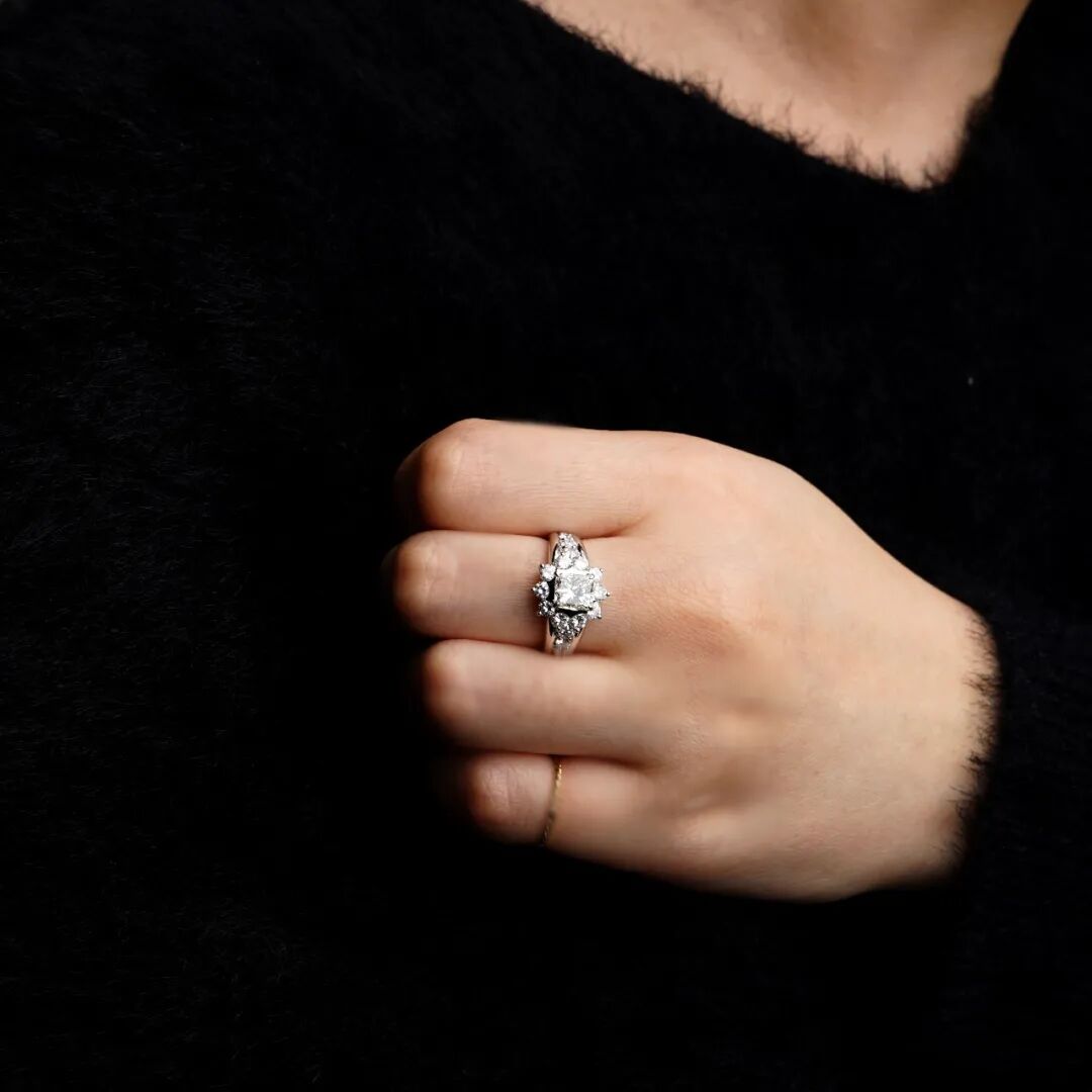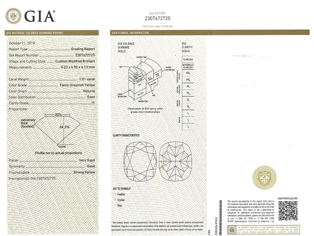 18K白金镶嵌天然钻石戒指,主石共重约1.01克拉,枕垫型切割,颜色为彩绿黄色(Fancy Greenish Yellow),配镶水滴型及圆形钻石共重约0.50克拉。