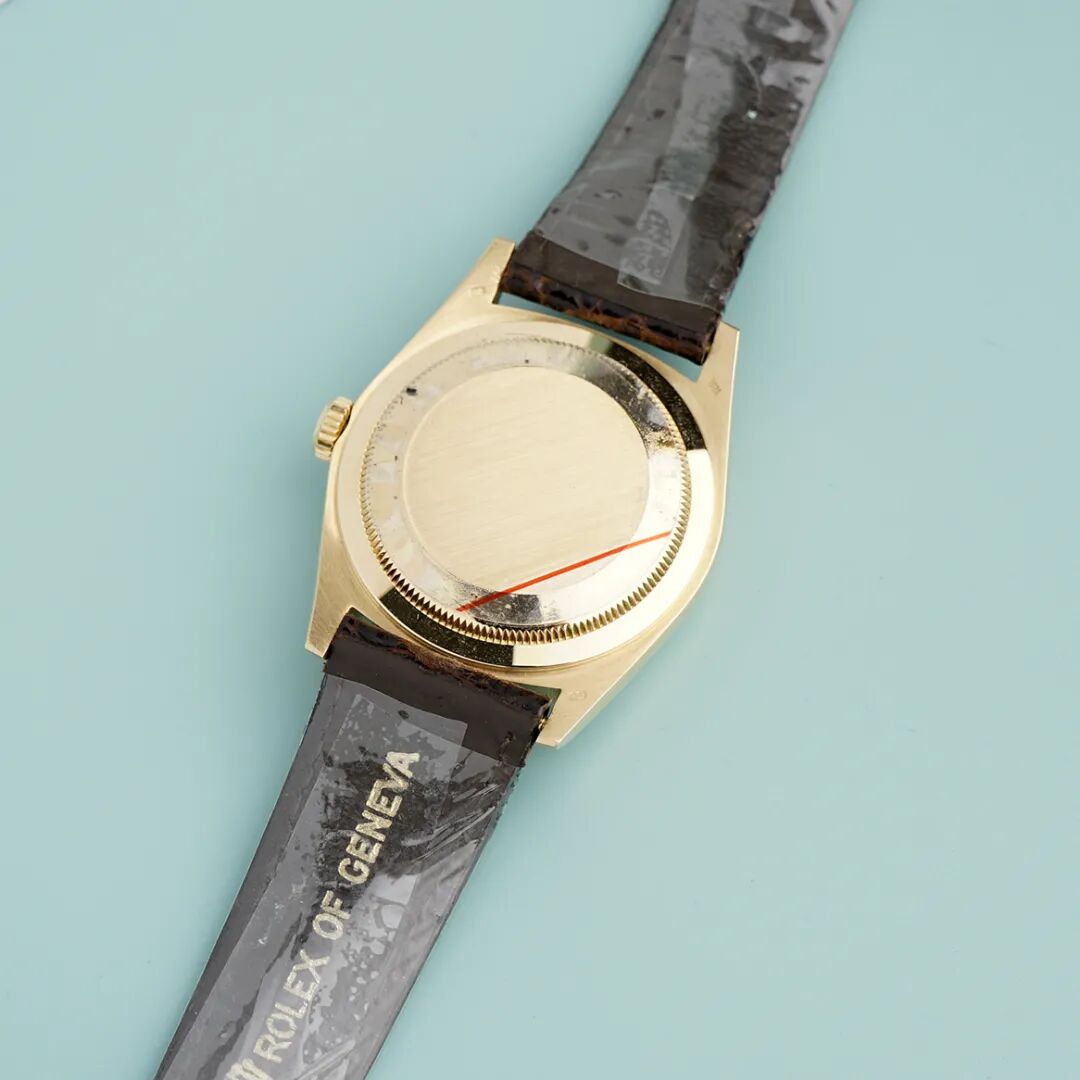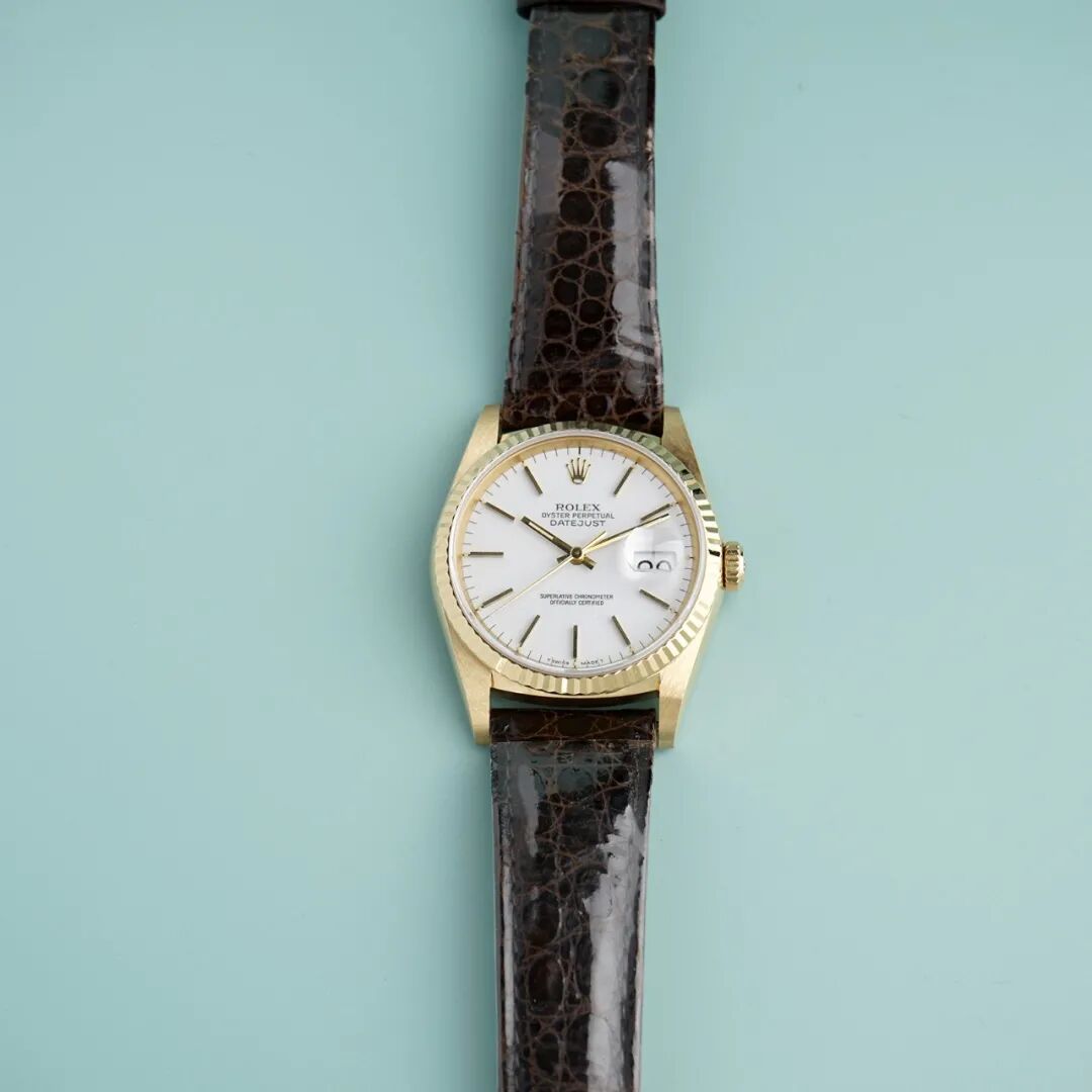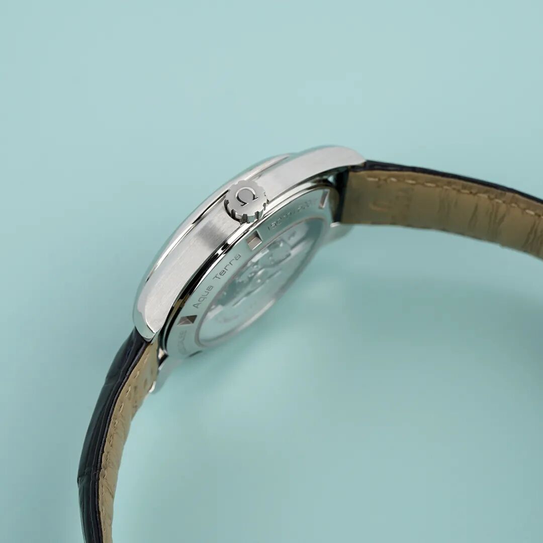 白色表盘,蓝色大三针,罗马字刻度。3点钟日期显示