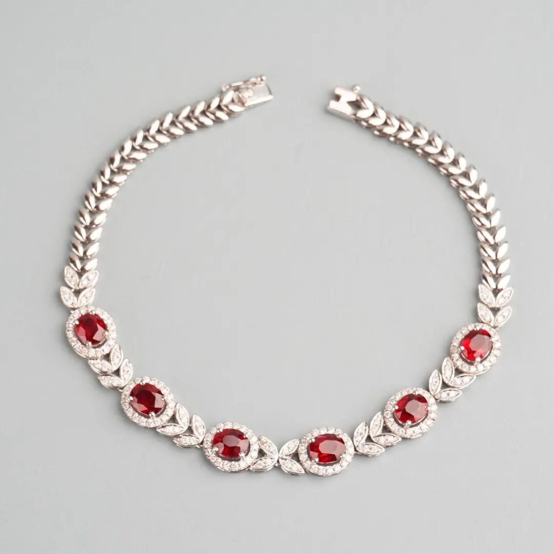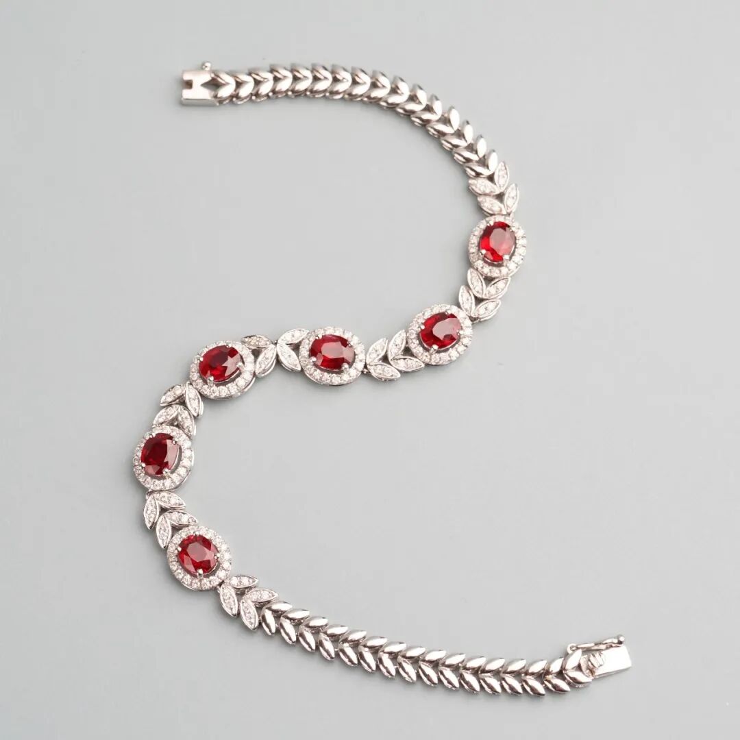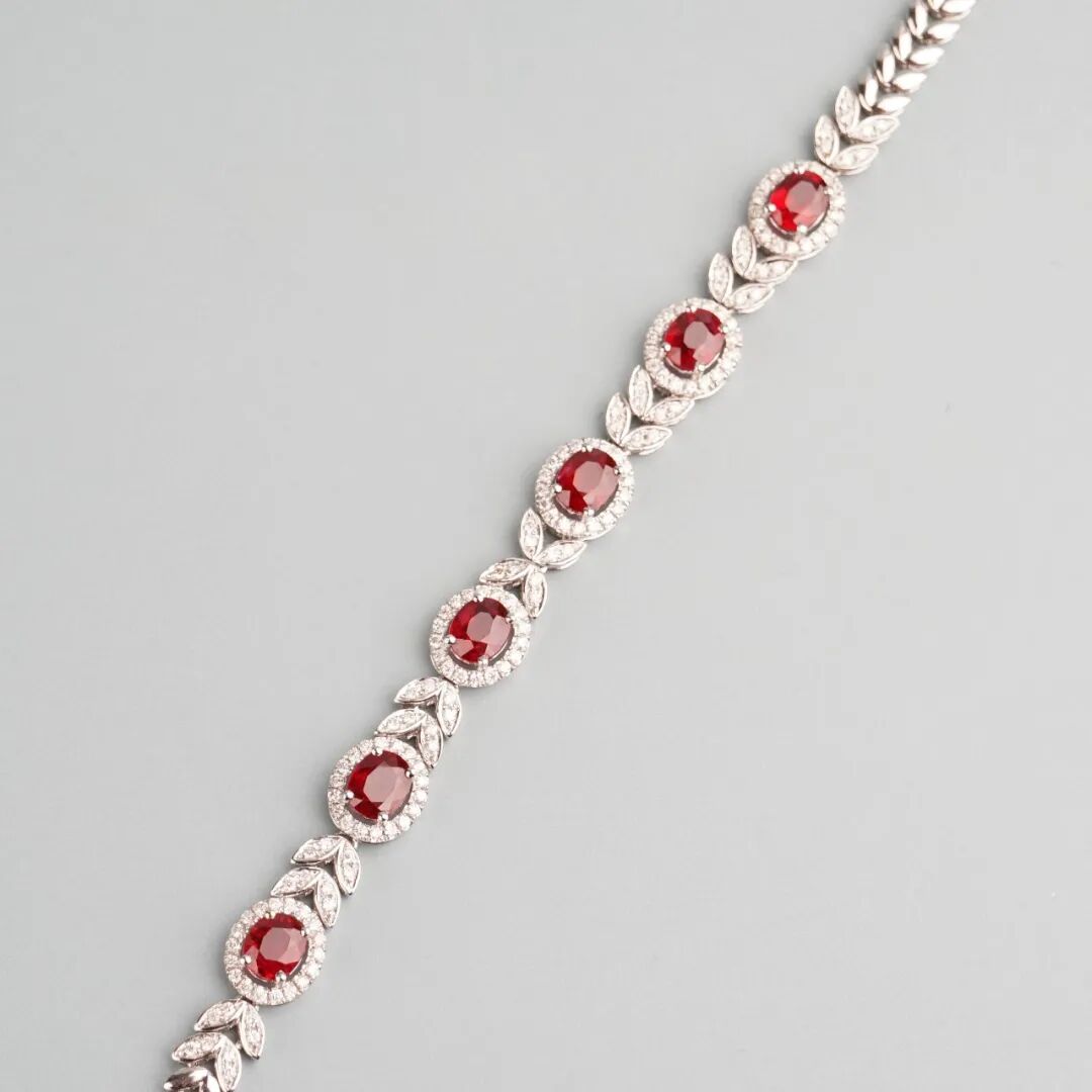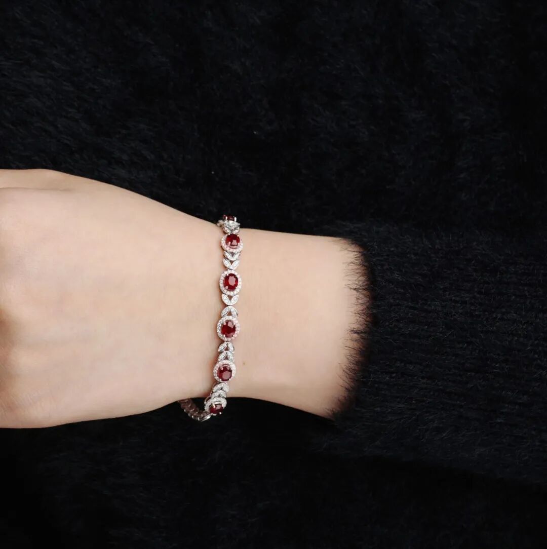18K白金镶嵌天然红宝石手链,红宝石共重约3.293克拉,配钻石共重约0.75克拉。